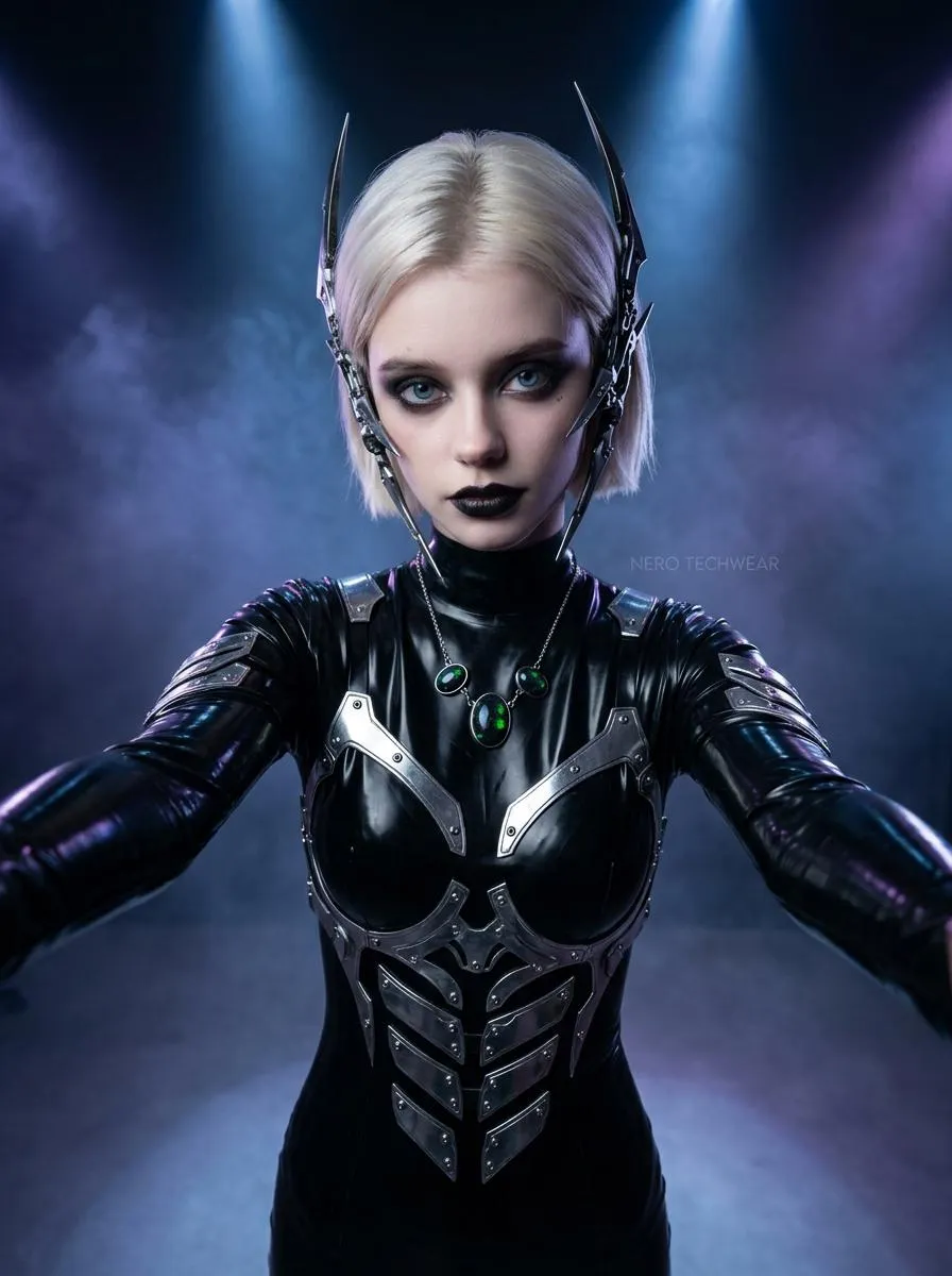 Generate futuristic cyberpunk selfies with AI. Create medium close-up portraits featuring silver bio-mechanical headpieces, platinum blonde hair, black latex dresses & glowing opal accessories. Realistic 8K AI fashion photography in a dark studio with cinematic lighting. Achieve avant-garde, intimidating cyberpunk style effortlessly with vivago.ai.