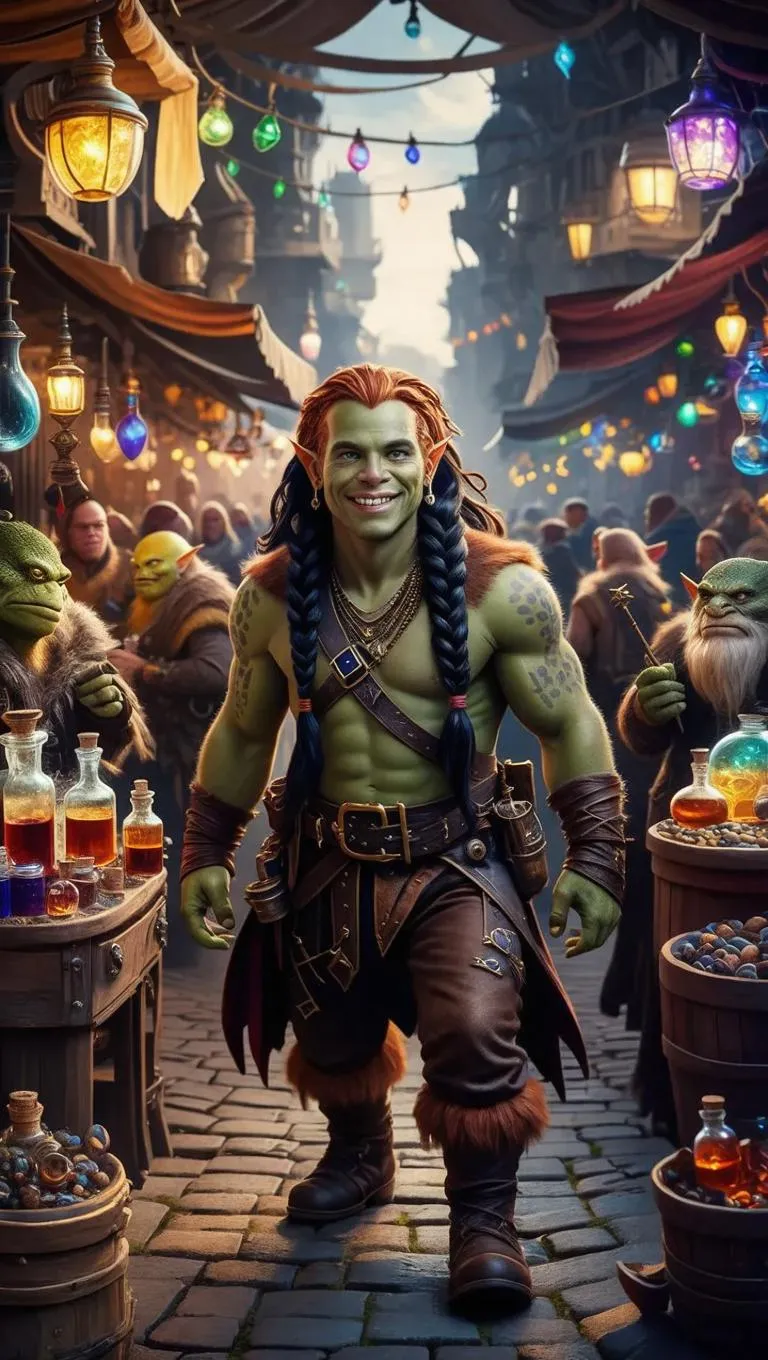 Vivid ink painting of a steampunk metropolis bustling with a magic-infused marketplace. Diverse crowds of orcs, dwarves, and lizard folk browse stalls laden with potions and enchanted items. A copper-skinned dwarf thief grins beside his towering half-orc barbarian wife, their contrasting styles illuminated by glowing lights. AI-generated fantasy art blending cinematic detail, mystic ambiance, and glitch effects for immersive storytelling.