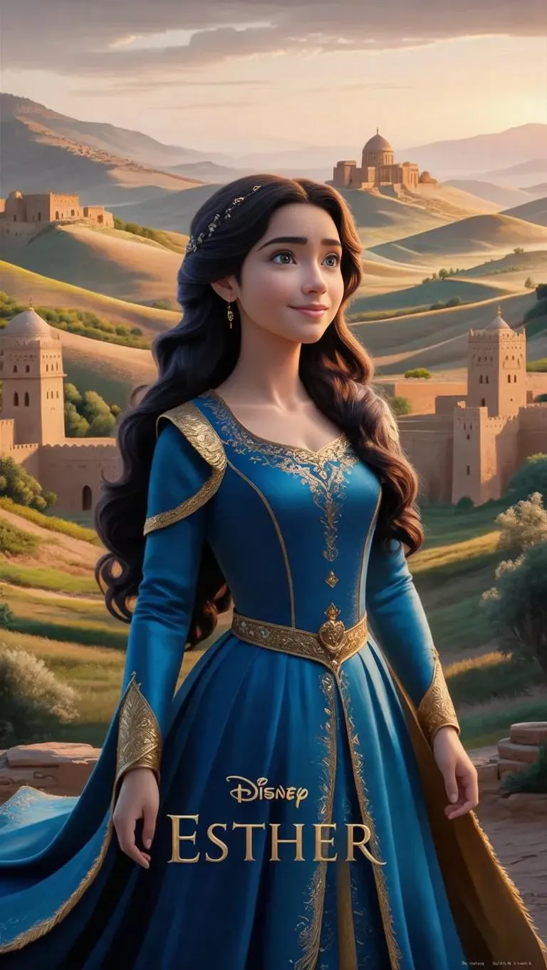 Generate Disney Pixar-style AI images of Esther in a royal blue & gold gown amidst ancient Persia's serene landscapes. Create peaceful, introspective scenes with rolling hills, distant palaces, and soft warm lighting using Vivago.ai's AI-powered tools for professional visuals.