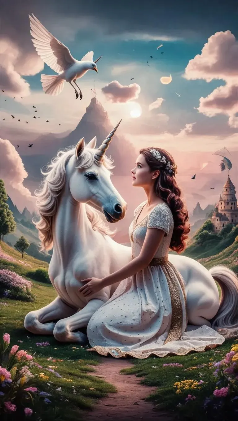 Create surreal AI-generated art of a winged fairy touching a white unicorn's head in a dreamland. Use vivago.ai's tools for mythical creatures, visual storytelling, and ethereal side-view compositions with advanced AI image generation and professional editing features.