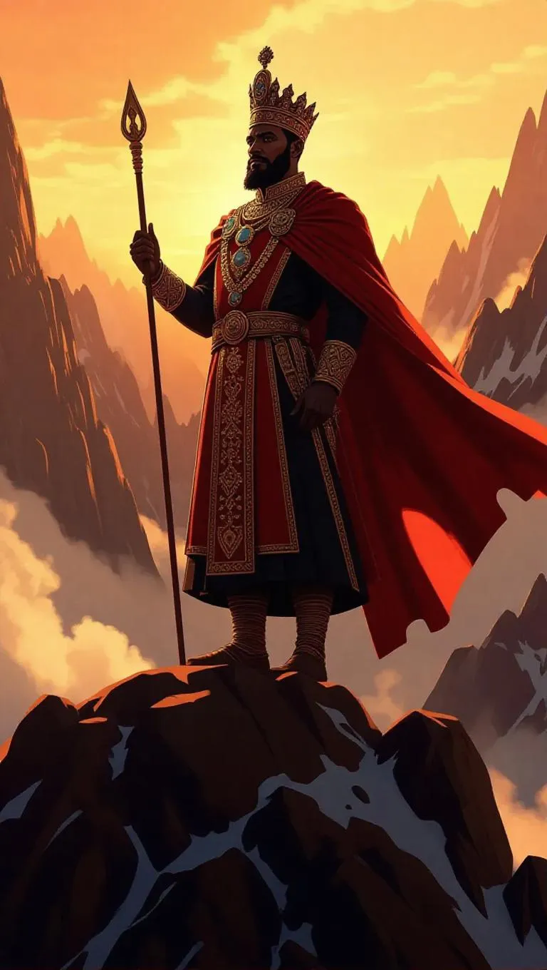Generate AI cartoon art of Emperor Menelik II standing regally atop a mountain, overlooking Ethiopia's vast highlands. AI image tools create vibrant visuals of his crown, flowing cape, and glowing sunrise backdrop. Perfect for historical storytelling or artistic projects with professional-grade AI effects and stylized editing.