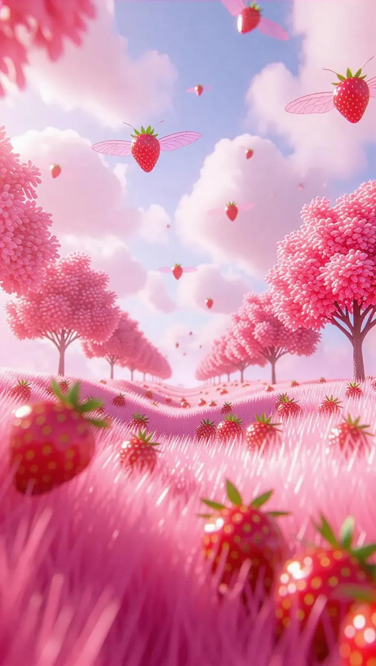 Discover AI-crafted Ever-Strawberry Skyfields: surreal landscapes with pink strawberry meadows, floating humming fruit, and winged marmalade moths. Transform prompts into whimsical visuals featuring whipped-cream clouds, songburst berries, and nostalgic charm—curated AI magic for enchanting, professional-grade creative projects.
