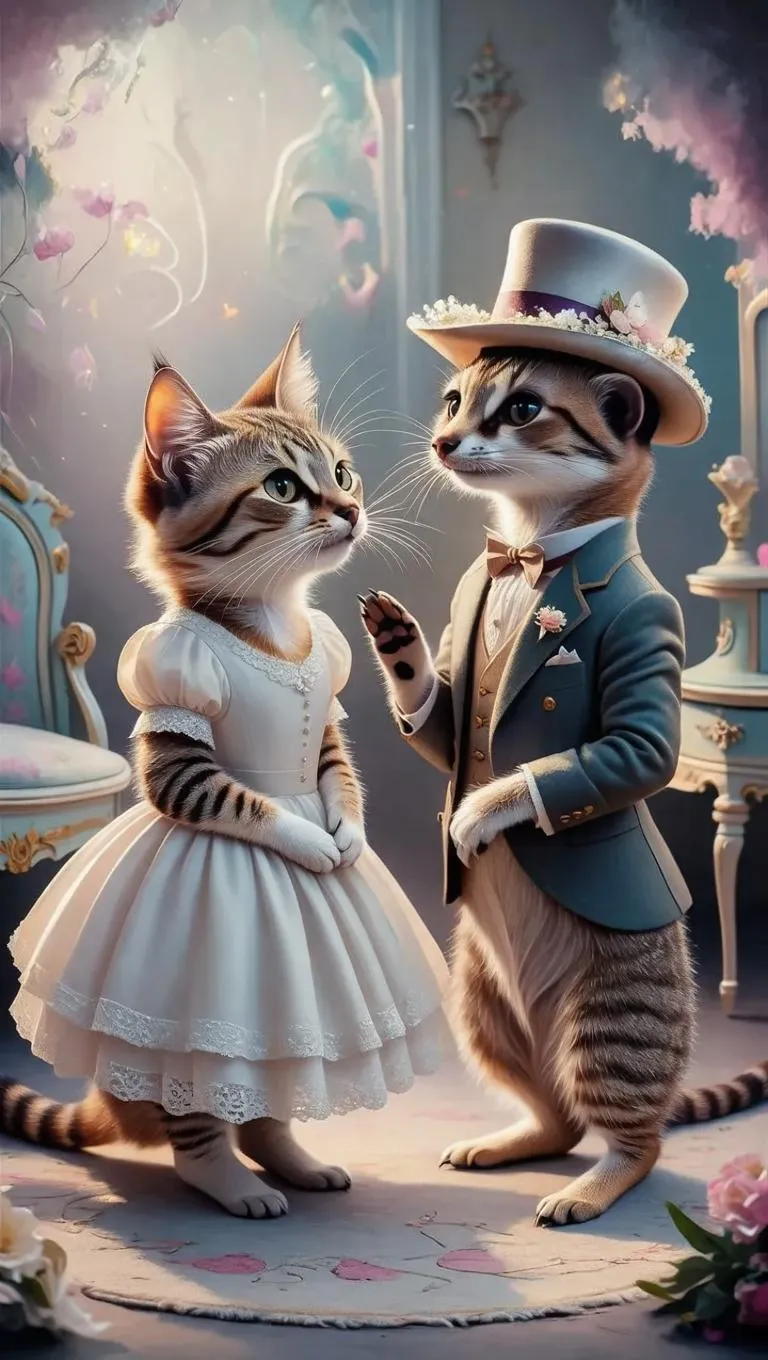 Enchanting AI-generated art of a cat in a white dress and hat with a dapper meerkat in a magical fairy tale setting. Featuring dreamlike mist pastel tones, shabby chic abstract style, and ethereal blurred backgrounds with vintage furniture. Transform ideas into whimsical visuals using Vivago.ai's creative AI tools.