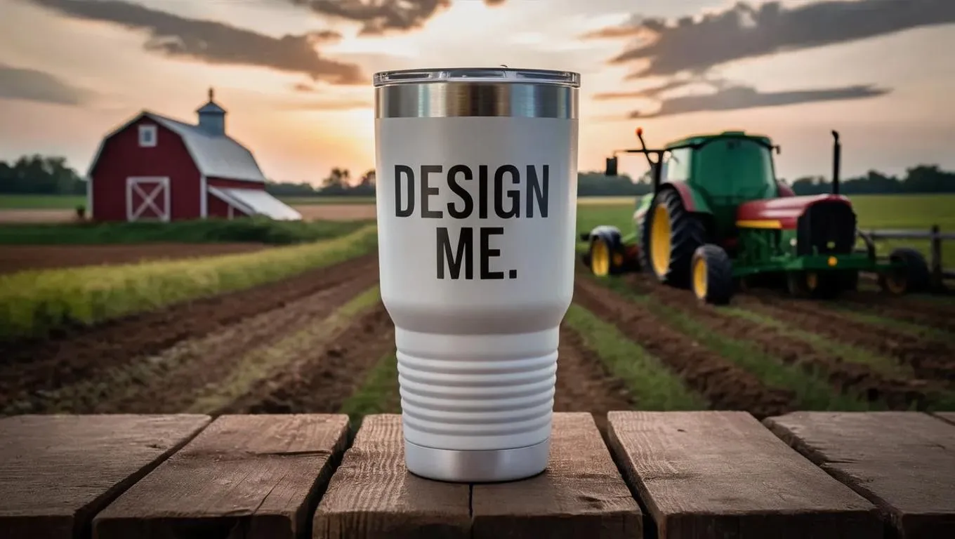 Design a personalized tumbler with "Design Me" text and farm-themed backgrounds using AI tools. Create rustic, custom designs perfect for agriculture enthusiasts. Easy-to-use AI effects for professional-grade results. Ideal for promoting your product with unique, creative flair.