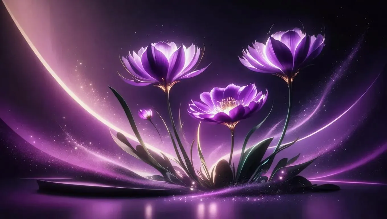 Create AI-generated futuristic floral wallpapers with vivago.ai. Transform prompts into ultra-modern designs featuring glowing violet flowers on gradient purple backgrounds. Add magical dust and luminous particles for a sci-fi aesthetic. Sleek compositions blend dark tones with neon accents, offering serene, minimalist visuals. Perfect for sci-fi inspired, calm decor.