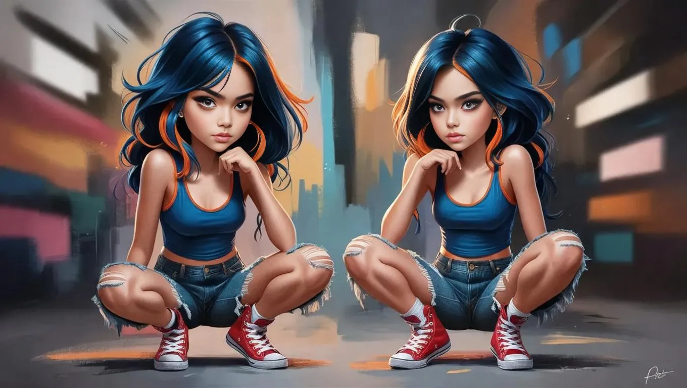 Create an AI-generated sketch of a girl in an orange tank top and dark blue hair, wearing blue shorts and red lace-up shoes. Transform text prompts into vivid visuals with VivaGo's AI tools for professional-grade creative results.