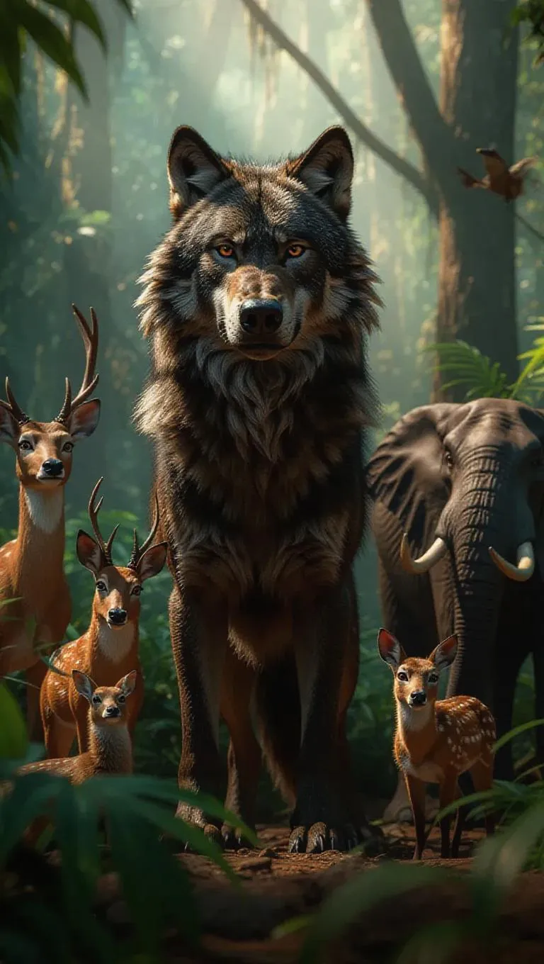 Pixar-style photorealistic image, a majestic wolf stands tall, eyes blazing with determination, trying to assert dominance as the king of the jungle. Surrounding him, a variety of intimidated animals, including a timid deer, a wary monkey, and a cautious elephant, create a tense atmosphere in the lush, vibrant forest.