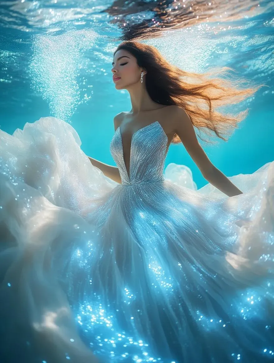 Ultrarealistic 64K AI-generated image of a stunning woman in a bioluminescent silver dress, floating underwater with ethereal hair movement. Captures magical realism, vivid silver glow, and ultra-detailed RAW photography effects. Perfect for professional-grade AI visuals, blending fantasy and hyperrealism in a high-resolution underwater scene.