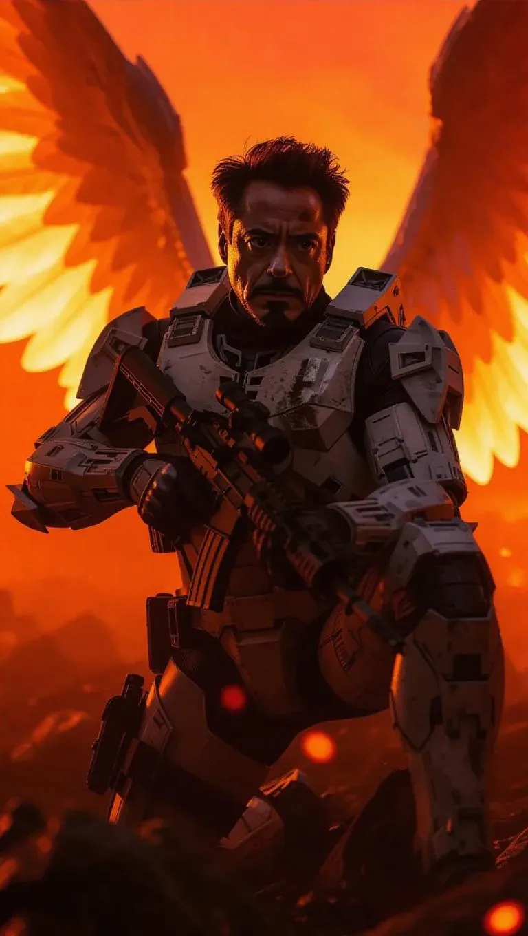 Generate AI-powered visuals of Robert Downey Jr. as Uriel, an angelic warrior in tactical gear with glowing ethereal wings. Scene features celestial assault rifle reloading amidst crashed gunship wreckage, red-orange sunset lighting, and battle-worn details - created through AI image generation for cinematic fantasy character art.