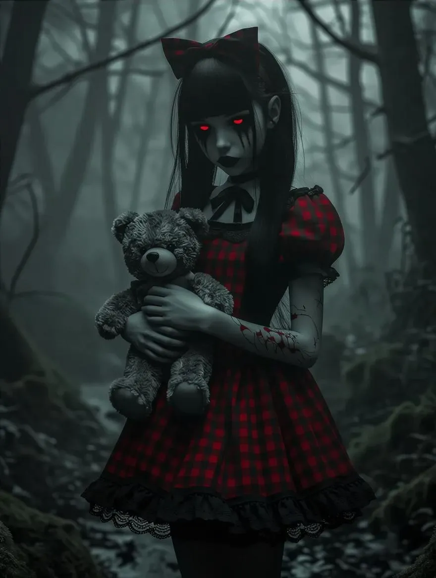 Gothic girl in a blood-red gingham dress with lace trim, holding a sinister teddy bear. Standing in a haunted forest, with a foggy atmosphere, and glowing red eyes. Tim Burton-esque style, eerie yet stylish, high contrast shadows --