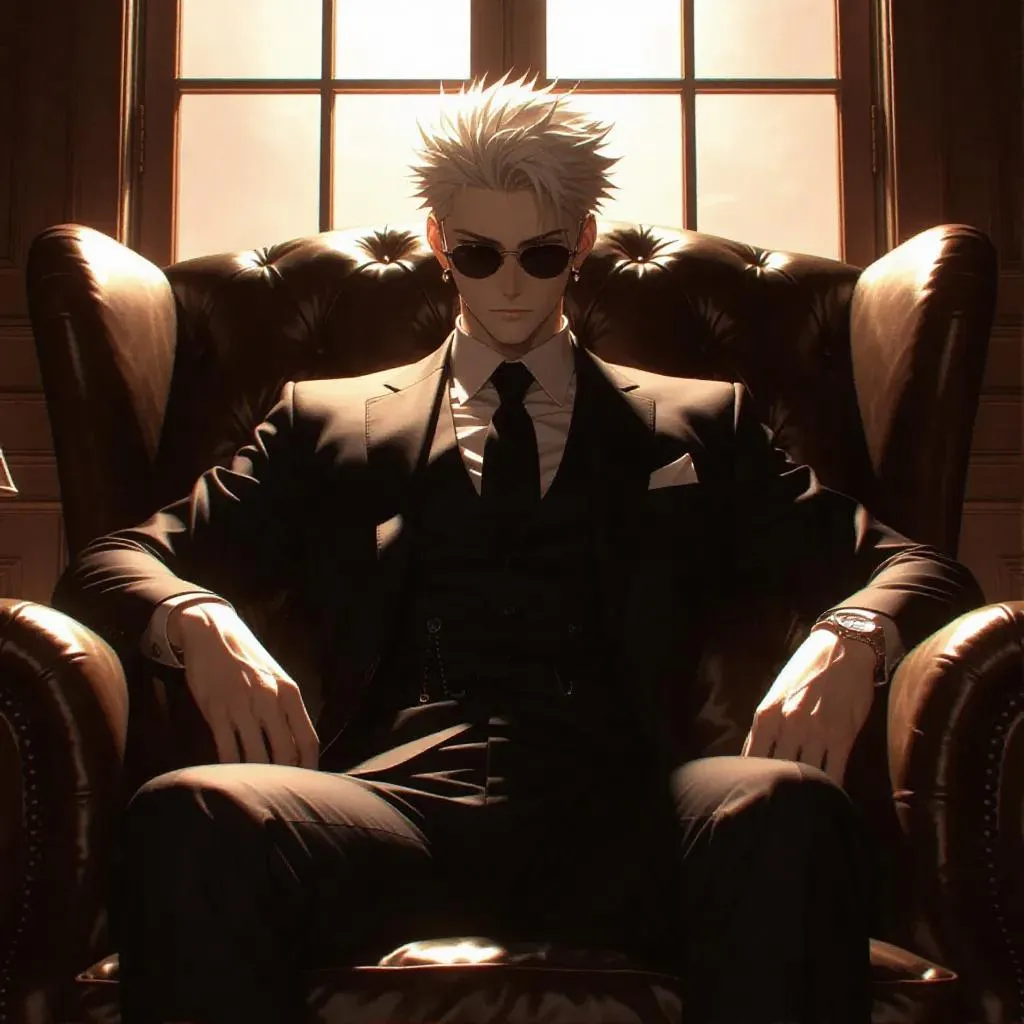 Create an AI-generated digital painting of Satoru Gojo from Jujutsu Kaisen in a sleek black suit and tinted glasses, exuding a mob boss vibe. Set in a classy modern loft with low-angle shots, backlighting, and rim light effects. Bold lines, high contrast, and fantasy elements enhance this evil-inspired character art with Vivago.ai's professional tools.