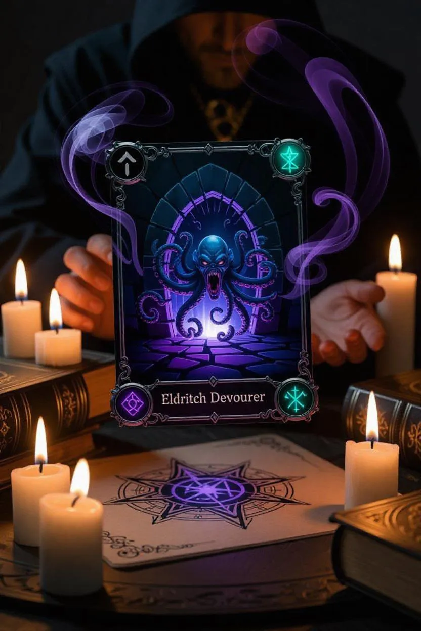 A sorcerer summoning a mystical card, titled "Eldritch Devourer," floats above a worn, ornate table amidst flickering candles and ancient tomes. The card showcases a grotesque, tentacled creature bursting from a shattered, gemstone-encrusted portal, radiating an aura of malevolent energy. Swirling, ethereal mist in shades of indigo and violet surrounds the sorcerer. The card's rarity is denoted by a holographic, silver seal. Glowing, runic symbols on the card's border pulse with an eerie, green light. Faction symbols, a black, inverted pentagram and a crimson, crescent moon, are emblazoned on the card's corners.
