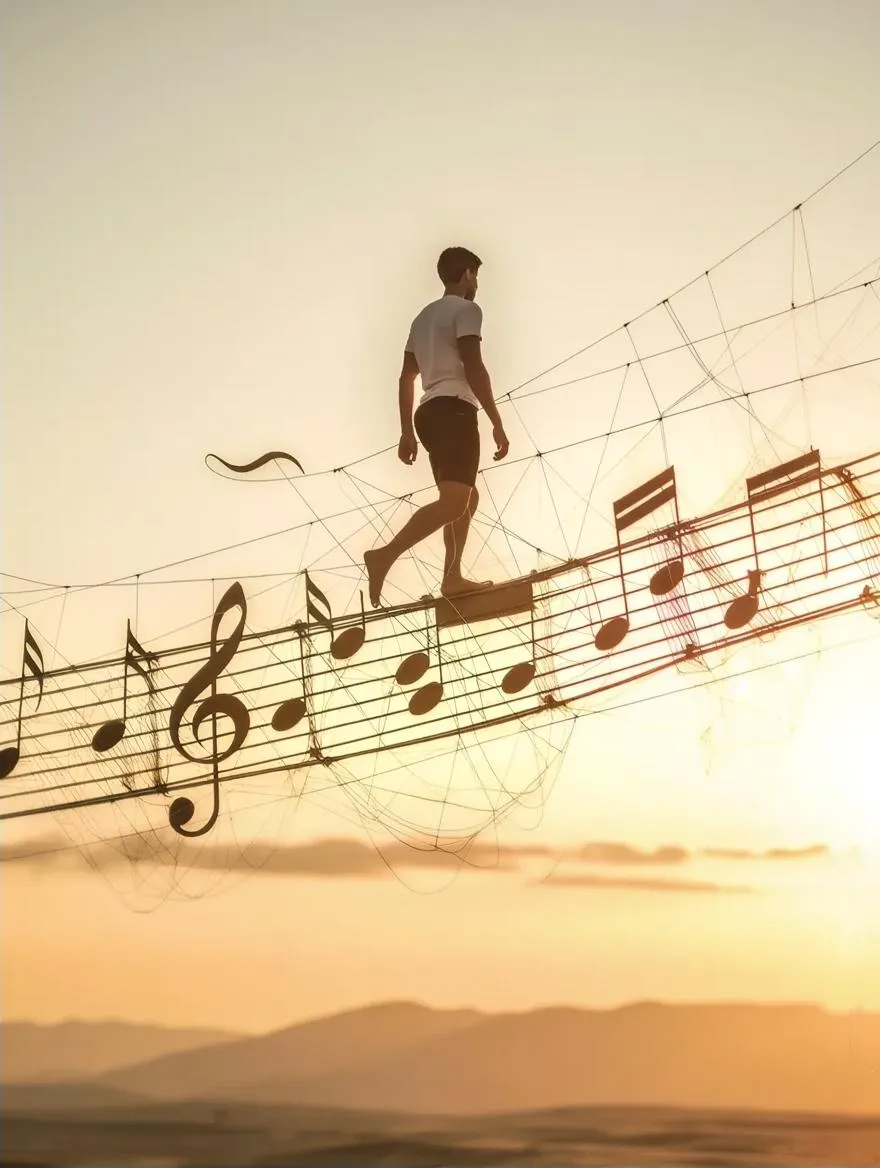 A man walks barefoot across a wire bridge shaped like a musical staff, captured from below. The distinct lines of the staff are clearly visible, stretching across the horizon as he gracefully crosses. The scene exudes a sense of freedom and balance, with the man’s posture confident yet serene. The soft glow of a setting sun casts elongated shadows, highlighting the delicate tension between the wire and the man’s feet. The composition blends surrealism and minimalism, with hyperrealistic details that evoke both harmony and daring, creating a visually striking and dynamic atmosphere.