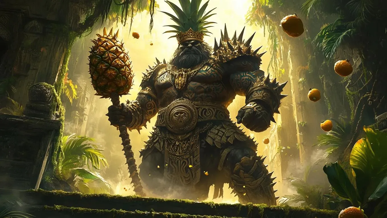 Throne room deep in an ancient jungle temple, overgrown with thick vines and lush fruit trees. The jungle king—an imposing armored giant with intricate tribal tattoos and armor crafted from spiky pineapple scales—raises a massive, spiked pineapple warhammer as enemies storm the mossy steps. His crown is a carved-out pineapple top, and his breath fogs the air, adding to the tension. Shafts of golden sunlight pierce through the dense canopy, illuminating floating fruit dust. Dramatic shadows, lush textures, ultra-cinematic, 4K fantasy concept art.