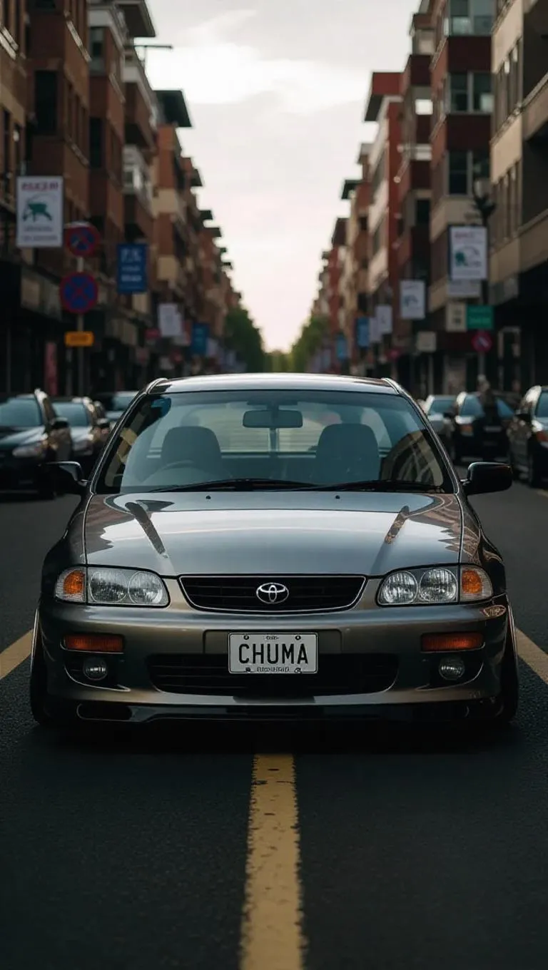 Generate a vibrant AI image of a 1990s Toyota Corolla with custom "CHUMA" license plate in motion. Transform text prompts into nostalgic car visuals using AI image generation tools. Perfect for retro automotive art, vintage vehicle designs, and dynamic perspective photography with professional-grade editing effects.