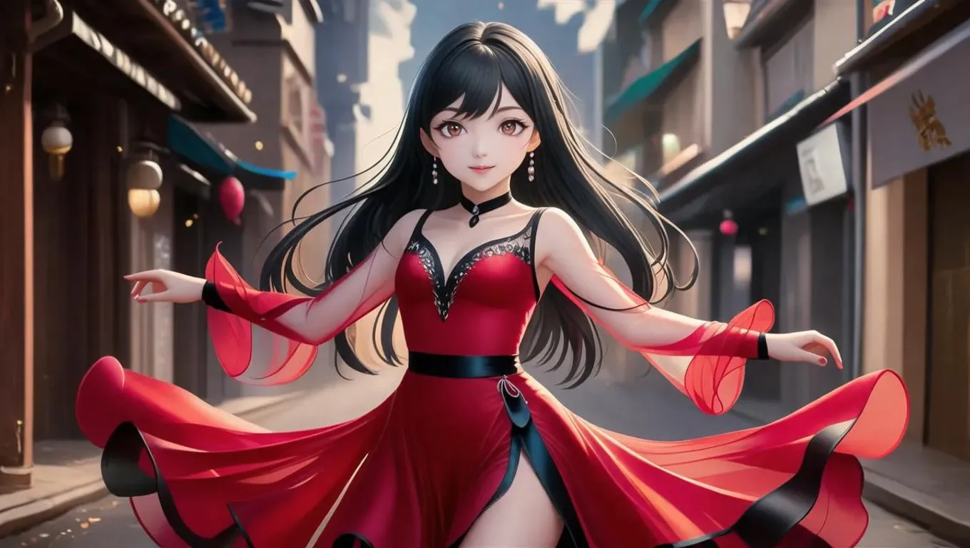 Create stunning anime manga-style AI art of a 16-year-old girl with long black hair, brown eyes, slim build, and fair skin. Features a vibrant red dance dress with black translucent sleeves, blending dynamic character design with anime aesthetics for captivating AI-generated visuals.
