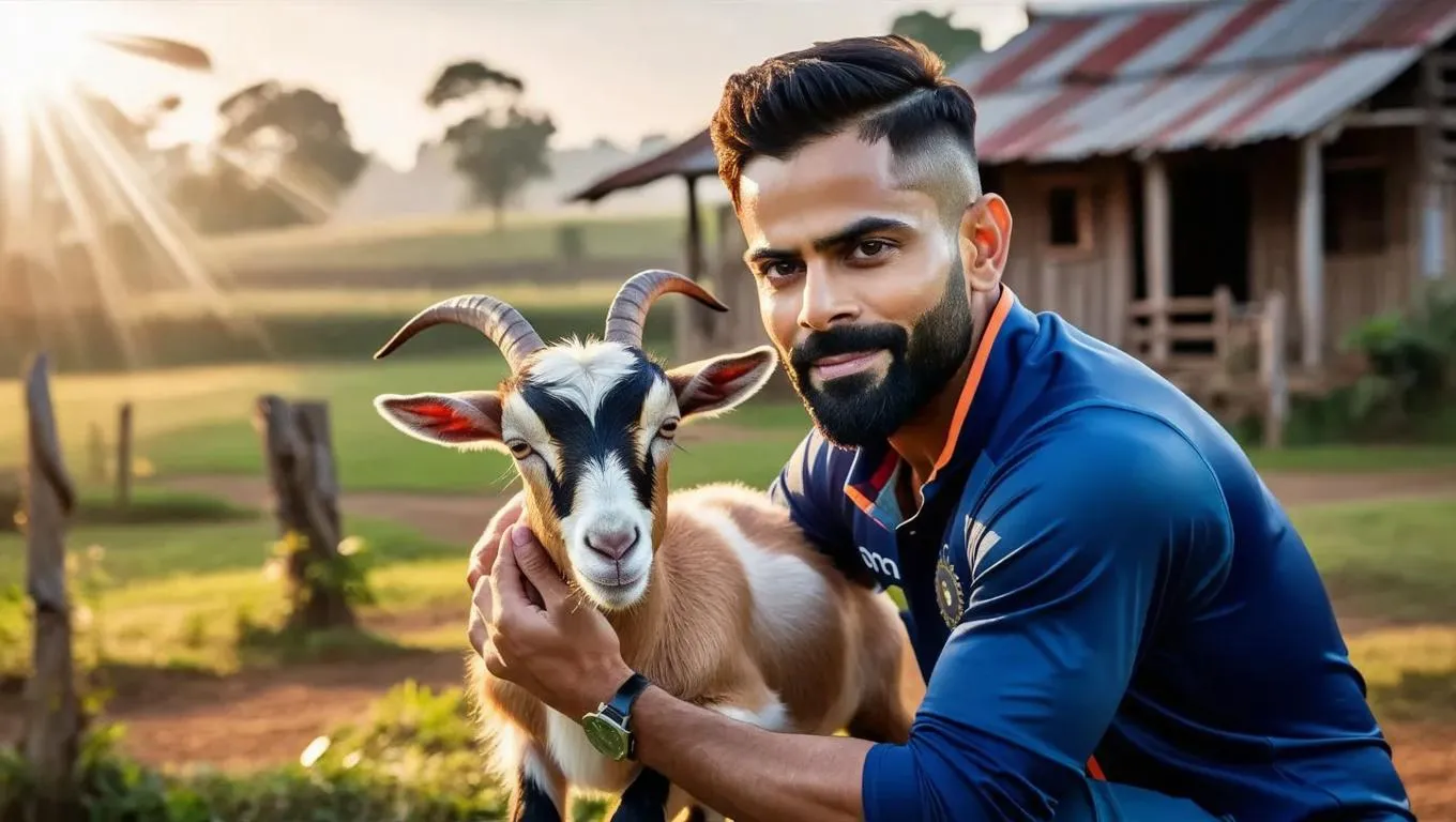 Craft an AI-generated photo of Virat Kohli holding a goat, blending cricket legend imagery with playful creativity. Transform text prompts into vivid visuals using VivaGo's AI tools. Generate lifelike, shareable content with professional-grade AI effects for sports fans and digital creators.