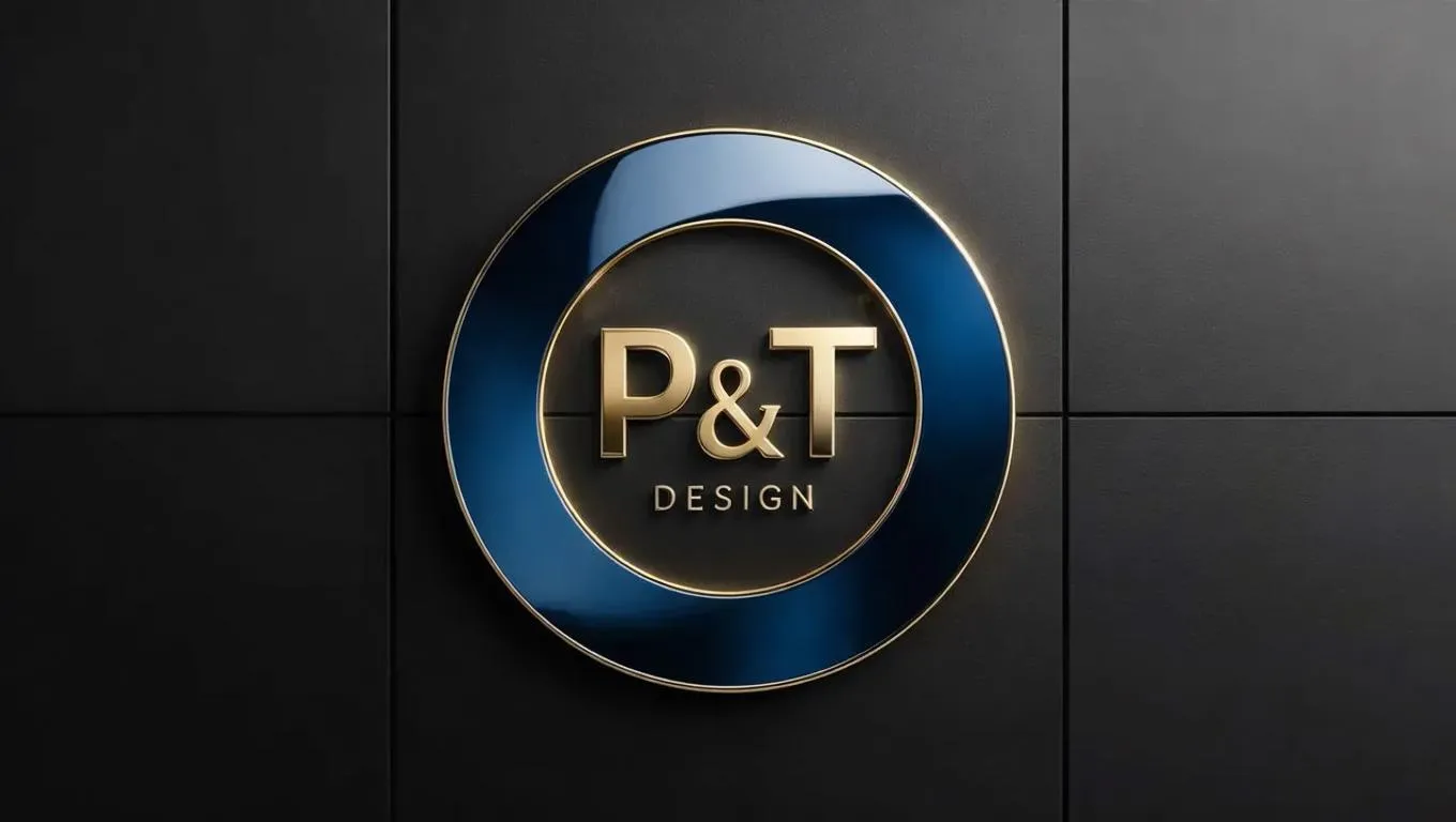 Craft a premium P&T DESIGN logo with AI: matte black backdrop, dark blue-gold glossy metal circle. Elevate branding with sleek, professional visuals using Vivago.ai's AI effects. Perfect for modern, eye-catching brand identities.