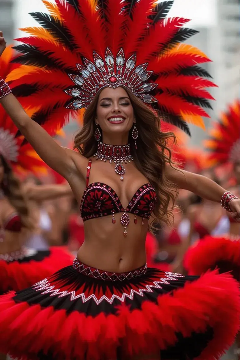 Vibrant AI-generated Rio Carnival visuals: stunning woman in red and black costume performs sensual dance. Create dynamic, lifelike carnival scenes with vivago.ai's advanced AI tools for professional-grade creative content. Transform text prompts into vivid performances effortlessly.