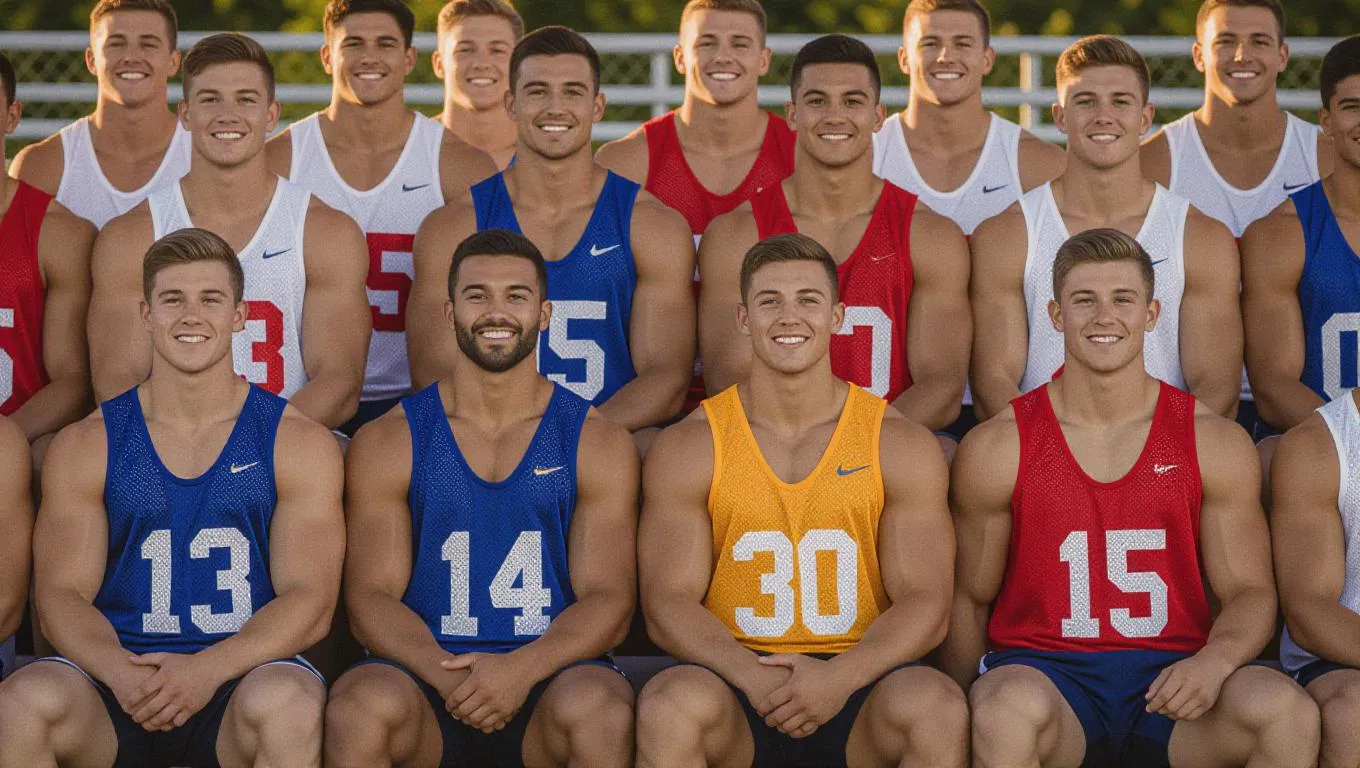 Generate a photorealistic image of muscular young jocks on bleachers. They wear bright, deep-necked lacrosse pinnies over matching shorts, showcasing hairy chests and broad shoulders. Crowded background features the team outdoors. AI creates this ultra-realistic portrait of athletic men in team sports gear. Create powerful imagery with vivago.ai's tools.