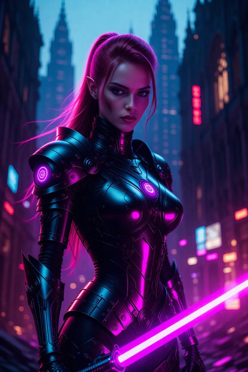 A biomechanical female elf warrior with intricate, glowing circuitry woven into her metallic armor, stands defiantly atop a ruined gothic cathedral overlooking a neon-drenched cyberpunk city. Her expression is fierce and determined, her eyes glowing with an otherworldly light. The air crackles with energy as she raises her plasma sword, ready to strike. Stark's signature circuitry pulses through her armored plates, casting radioactive halos across the scene. Animated strands of metallic hair flow like molten copper wires, shifting from fiery auburn roots to metallic rose-gold tips. Evoking the styles of Ash Thorp, Ian McQue, and Simon Stalenhag, this photorealistic, wide-angle portrait is a masterpiece of digital art.