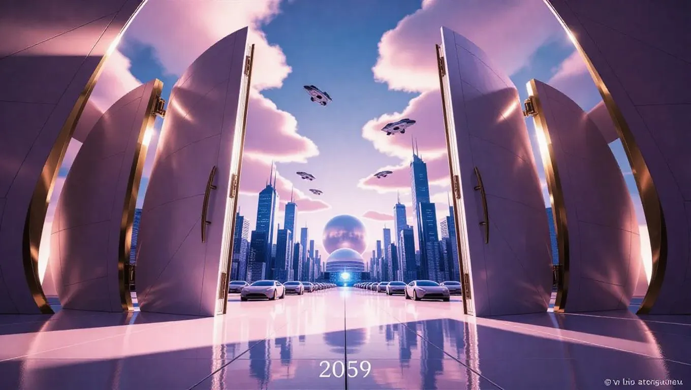 Step into 2059's cyberpunk metropolis with AI-generated visuals: futuristic glowing doors reveal a utopian cityscape of sleek skyscrapers, aerodynamic flying cars, and a neon-lit planetarium. Vivago.ai crafts optimistic futurism blending warm night glow, rule-of-thirds composition, and cyberpunk textures for vivid, high-tech urban energy.