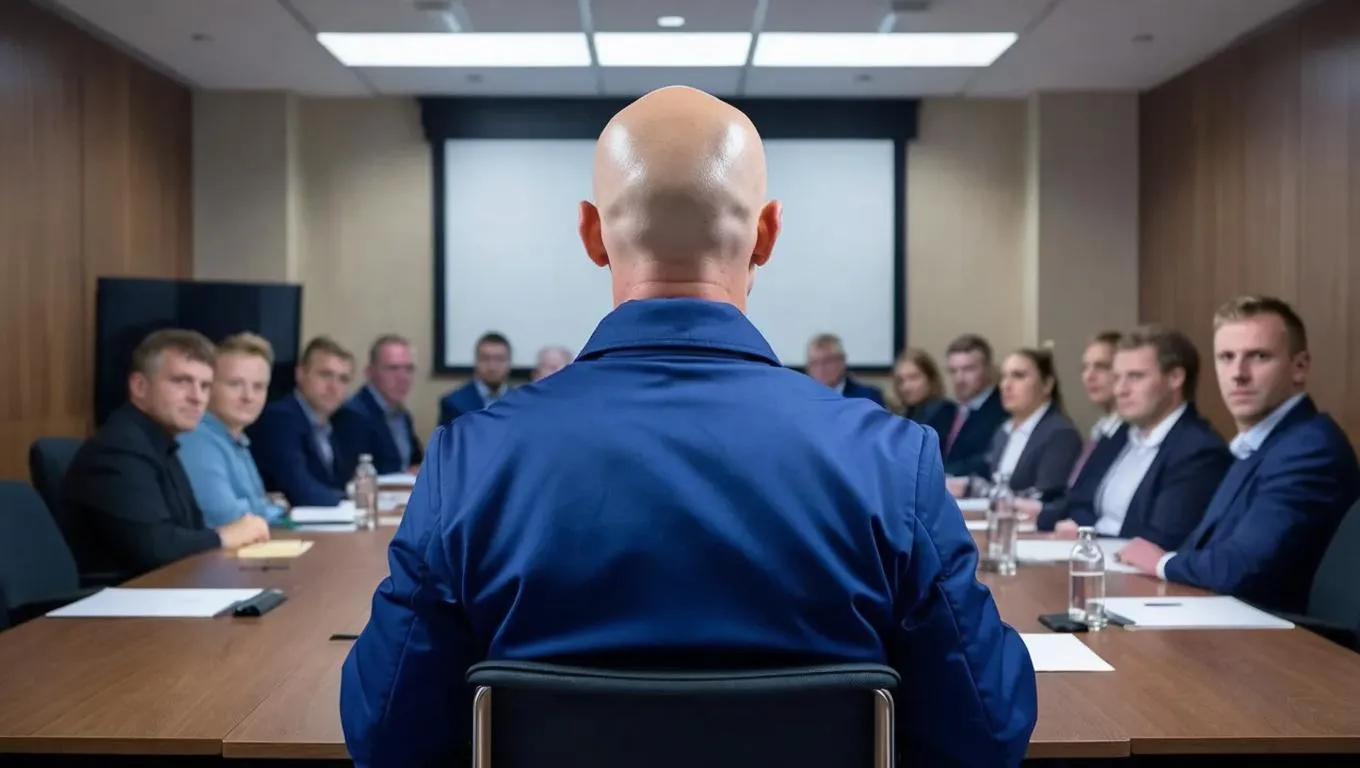 Generate professional AI images of a bald tutor in a blue jacket, viewed from behind in a modern meeting room. Perfect for educational content, corporate training visuals, or virtual classroom materials. Elevate your projects with vivago.ai's AI image generator for realistic, detailed, and professional-grade virtual scenes.