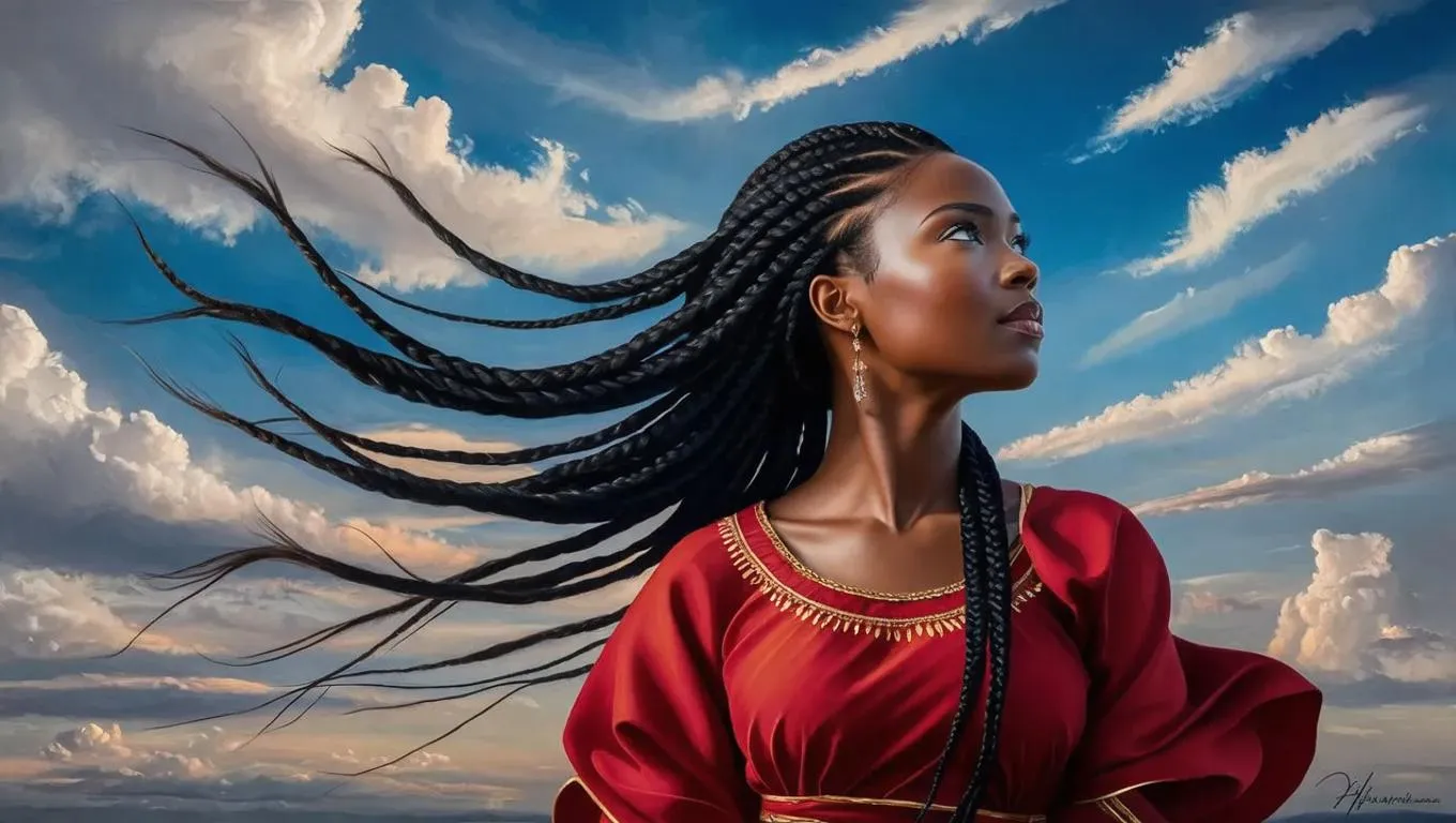 Capture the essence of a South African woman in a vibrant red dress, braided hair flowing skyward under azure skies. Realistic AI-generated portrait blends cultural elegance with dynamic motion, perfect for creative projects. Explore vivago.ai's tools for lifetailored, professional-grade visuals—ideal for evocative storytelling, profile art, or thoughtful character designs.
