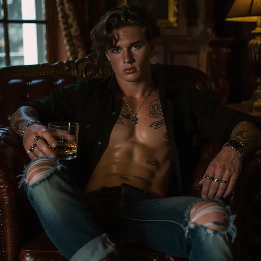 Photorealistic hyper-stylish young man with green eyes, auburn hair, tattoos, and bold jewelry lounges in ripped denim and avant-garde loafers. Moody French Normandy countryside house, rainy night ambiance. AI-generated visuals blend sharp realism, edgy fashion, and atmospheric storytelling. Create cinematic portraits effortlessly with vivago.ai’s professional AI image tools.