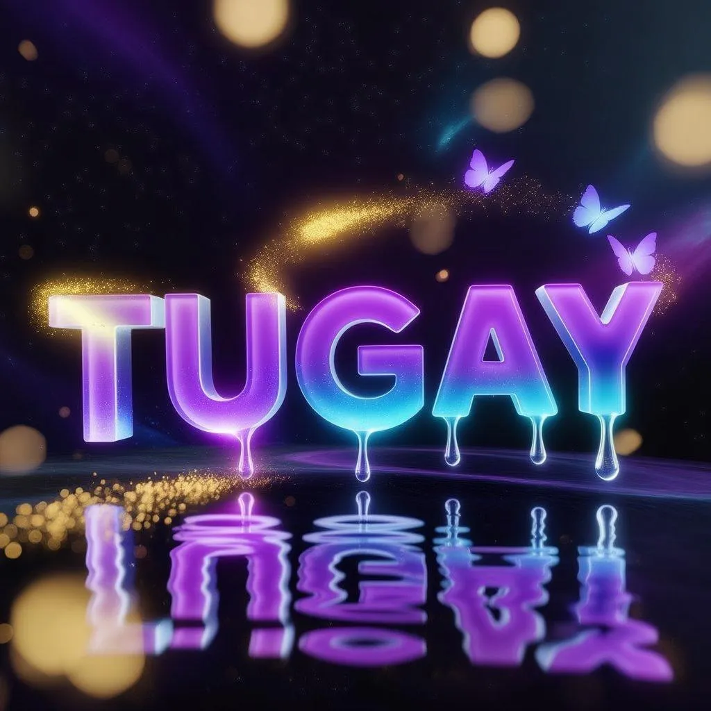 Vibrant 3D neon "Tugay" text with electric purple-to-cerulean gradients, holographic reflections on a cosmic stardust backdrop. Hyper-detailed Unreal Engine rendering features glossy acrylic textures, liquid-light drips, swirling supernovae, volumetric sparkles, cinematic depth of field, and chromatic aberration for dynamic, professional-grade visuals.