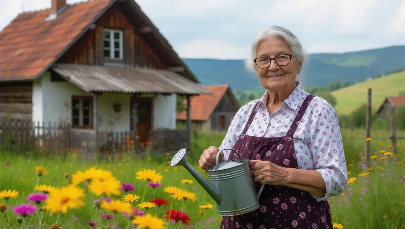 An old farmhouse stands on the edge of a small Hungarian village in the countryside, surrounded by rolling hills and vibrant wildflowers. Next to the house, in the garden, stands a 70-year-old woman with glasses, her silver hair gently blowing in the breeze. She holds a vintage watering can and smiles warmly, tending to the colorful blooms around her.