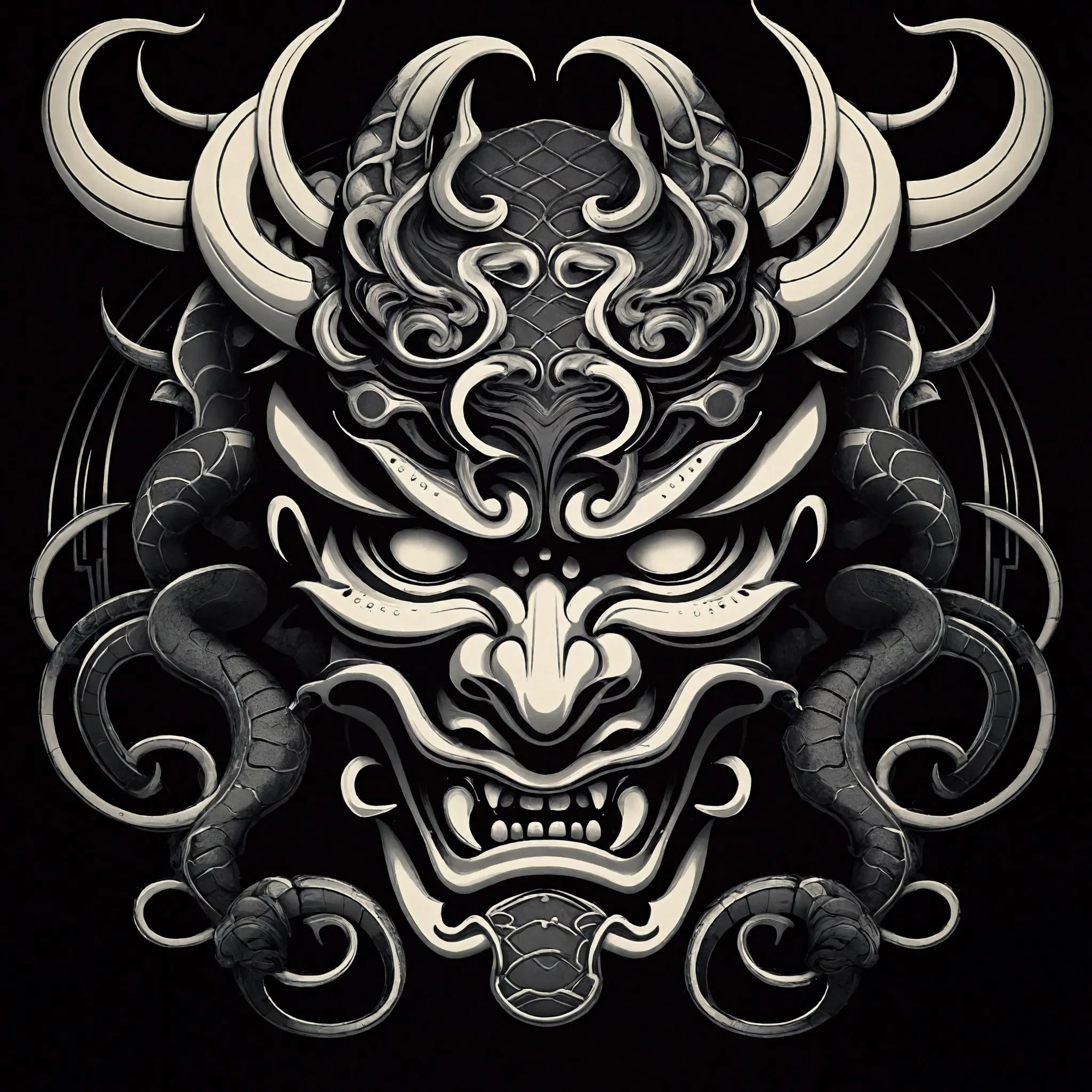 Create a striking black-and-white samurai oni mask logo with coiled snake motifs, sharp horns, and intricate circular grid patterns. This AI-generated design blends mystical symbols, alphanumeric textures, and Japanese warrior aesthetics for bold branding. Perfect for gaming, apparel, or cultural projects needing edgy, symbolic visual identity. Transform your brand with AI-powered precision.
