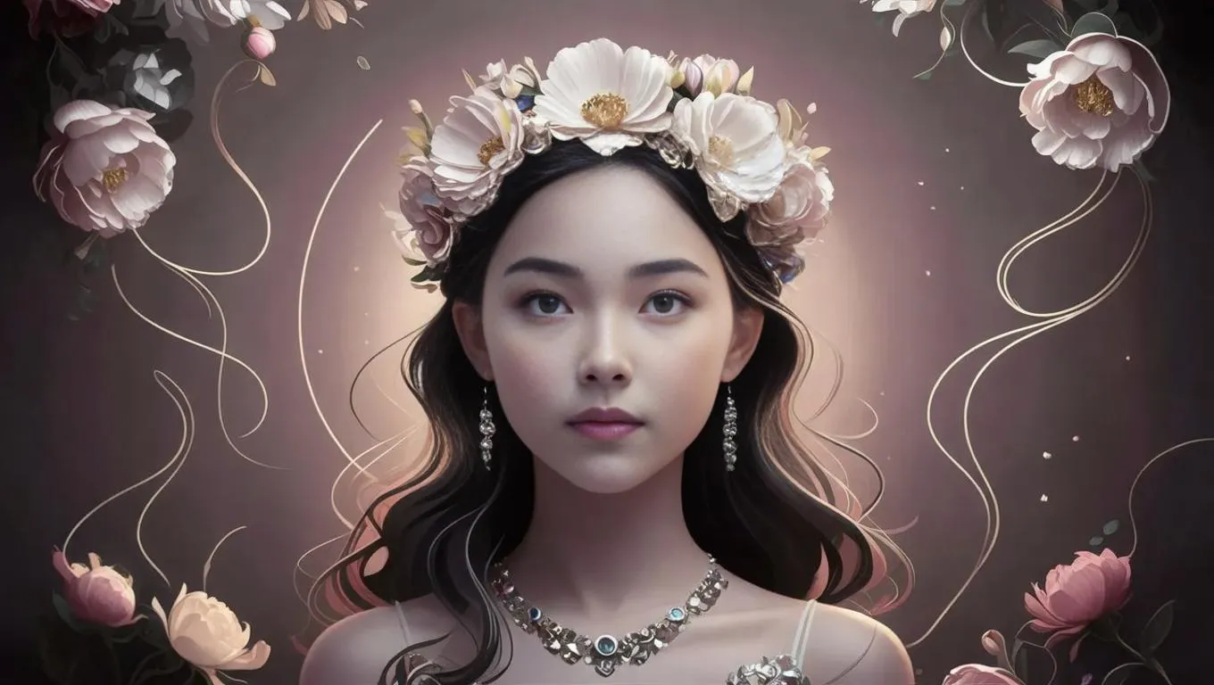Create a striking AI-generated art portrait of a floral-crowned girl with Frank Cho's boldness, Elina Karimova's soft lines, and Mono-ha minimalism. High-resolution fashwave aesthetics blend vivid details with strong emotion. Perfect for digital art lovers seeking stylized, professional-grade visuals using niji 5 and precise 6:11 aspect ratio.