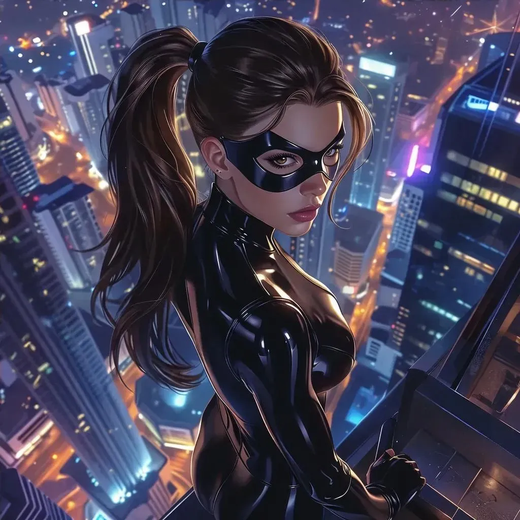 Create dramatic AI-generated superhero art with this high-definition night cityscape scene. Featuring a sleek brunette heroine in a black bodysuit, domino mask, and flowing ponytail overlooking a metropolis. Perfect for comic book visuals or action-themed projects using Ultra HD texture mapping for professional-grade results.