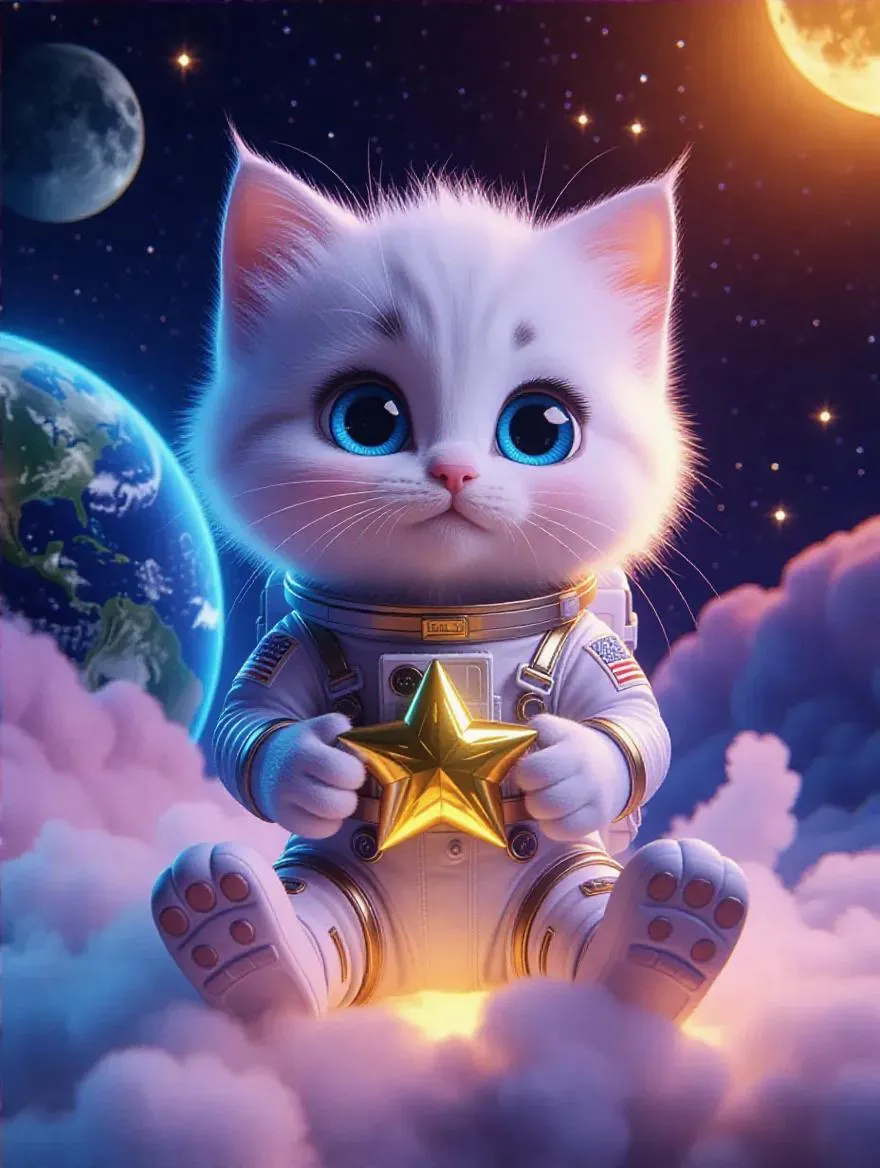 Generate a Pixar-style 3D fluffy white kitten astronaut with sparkling blue eyes, wearing a padded suit on glowing clouds, holding a star. Explore cosmic vistas with Earth, moon, and sun light. Use vivago.ai's AI effects for vibrant, emotionally charming, high-quality cinematic results. Bring your whimsical vision to life.