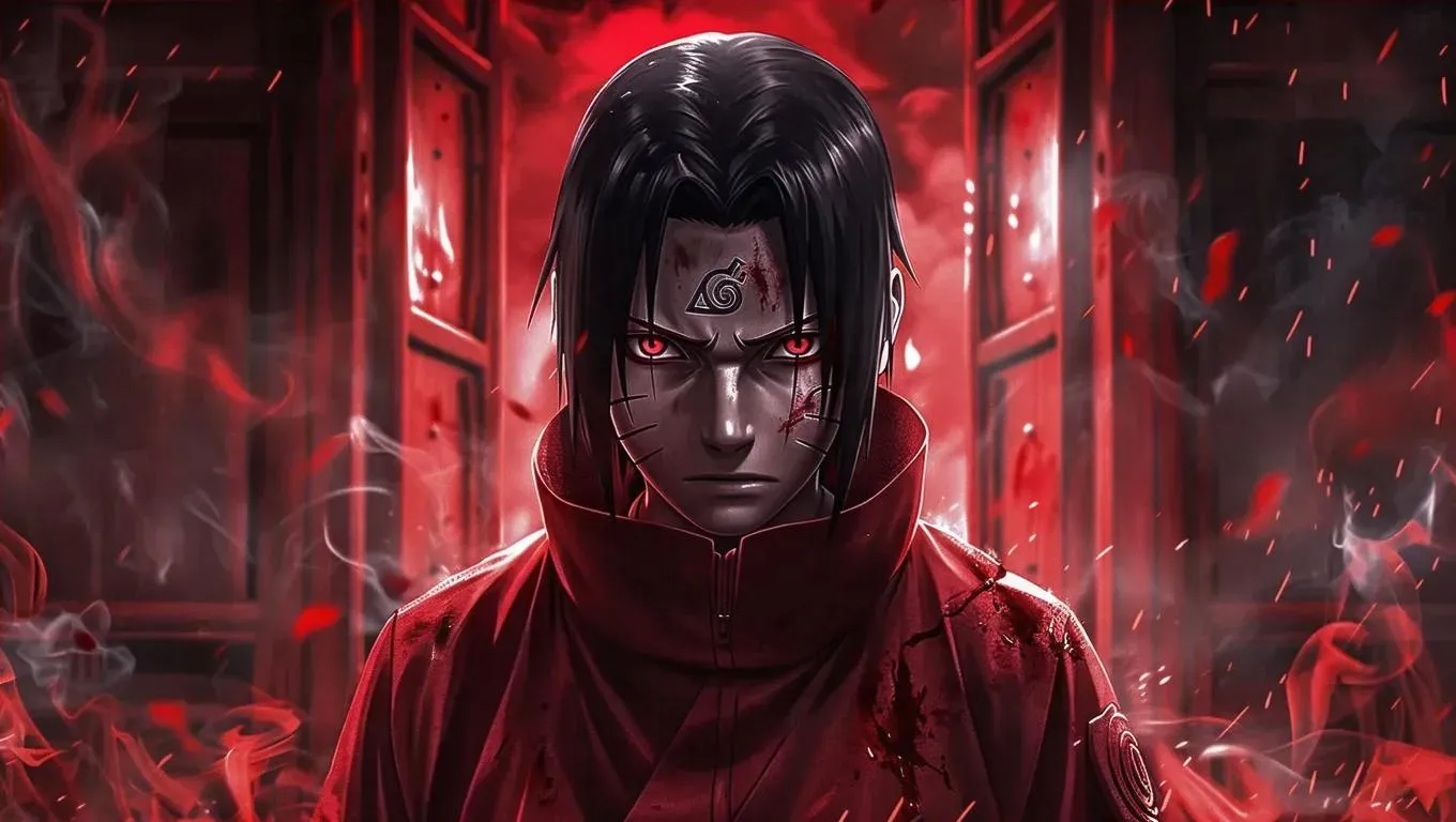Create striking AI-generated art of Itachi with intense red eyes, blood-stained face, and red attire. Set against a dramatic backdrop featuring a massive door glowing with red light and swirling smoke. Elevate your anime visuals with vivago.ai's advanced AI image generator for vivid, professional-grade character designs and dynamic effects.