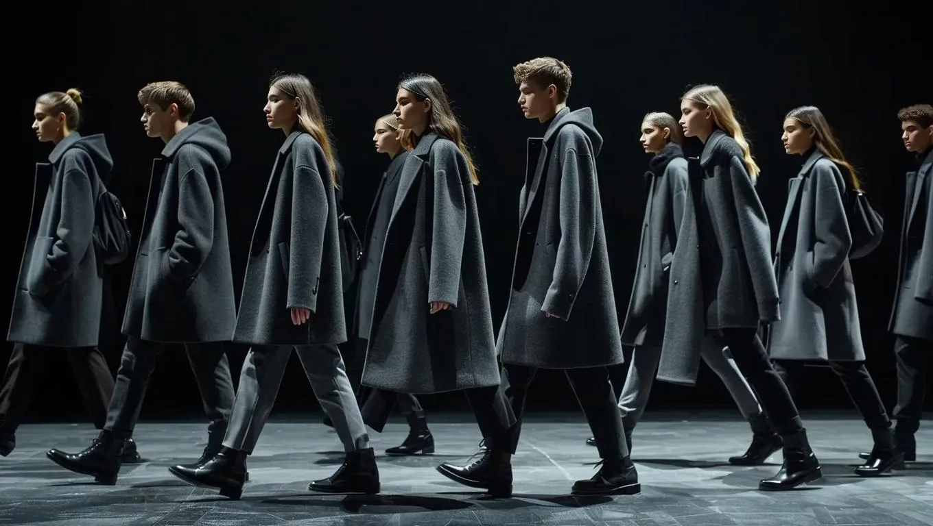 Dark gray male and female models stride in a dynamic group side view, cloaked in darkness with diverse urban attire. Elevate your creative projects with vivago.ai's AI-powered tools for realistic AI-generated visuals, professional editing, and striking effects. Craft professional-grade group scenes effortlessly.