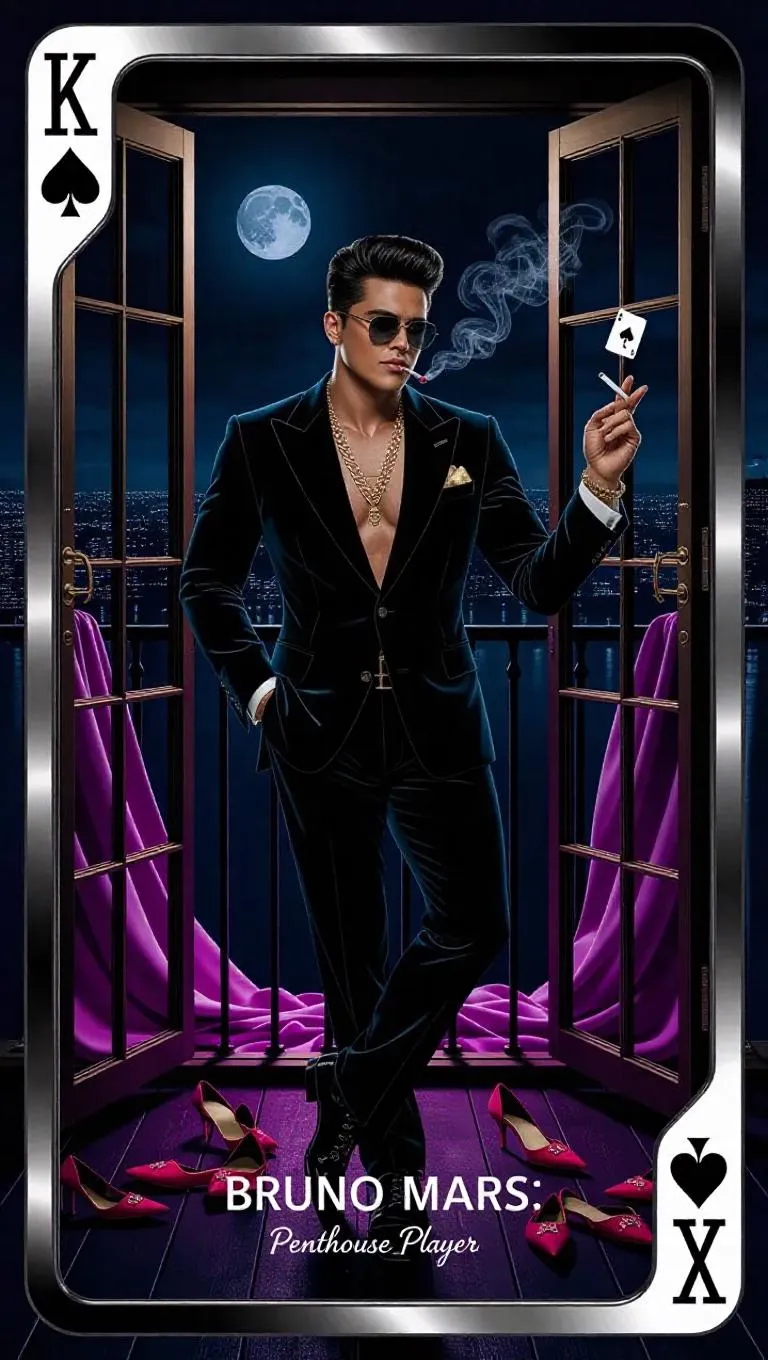 K♠ – Bruno Mars: Penthouse Player Styled in anime noir, card framed in obsidian chrome. Bruno Mars as the King of Spades — suave, dangerous, tailored in black velvet and gold chains. He leans on a balcony edge, cigarette glowing, shades reflecting the APT.’s nightclub lights. Pose: one hand in pocket, the other flicking an Ace of Spades into the wind. Behind him: open sliding glass doors with silk sheets tangled and a trail of red heels left behind. Hair slick, smirk lethal. Background: cityscape night, spotlight moon, faint sparks of fireworks. Card frame: deep black chrome, corners etched with gold spade icons, glitching slightly. Nameplate: “King of Spades – Penthouse Player” Vibe: temptation, dominance, velvet rhythm. ???? Matches lyric: “Sleep tomorrow but tonight go crazy”
