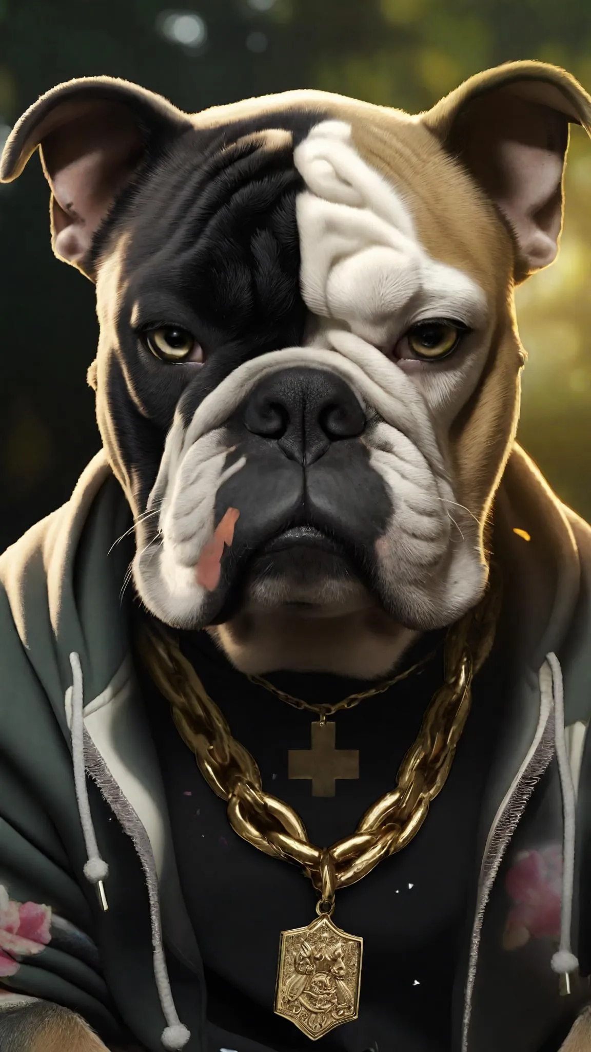 Generate a hyper-realistic 4K image of an urban-fashion bulldog in a serene park setting. AI-powered tools create sharp, cinematic visuals with vivid colors, flawless anatomy, and natural lighting—ideal for artistic projects, social media, or commercial designs blending anthropomorphic charm with professional-grade detail.