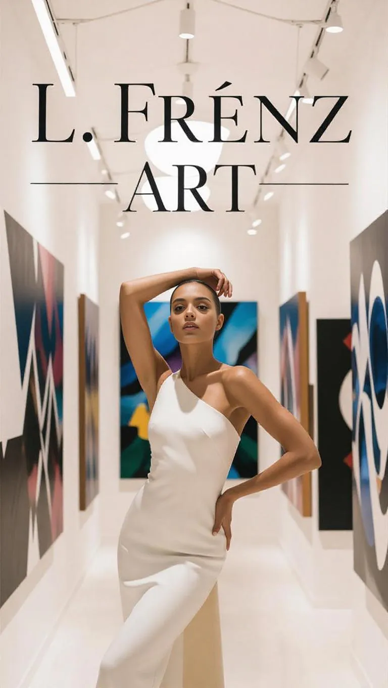 Create AI-generated art with a poised female model in a contemporary gallery surrounded by modern abstract pieces. Featuring "L. Frenz Art" signage and soft ambient lighting, this prompt crafts avant-garde visuals blending sophistication, intricate details, and professional AI image generation for striking, artistic photography.