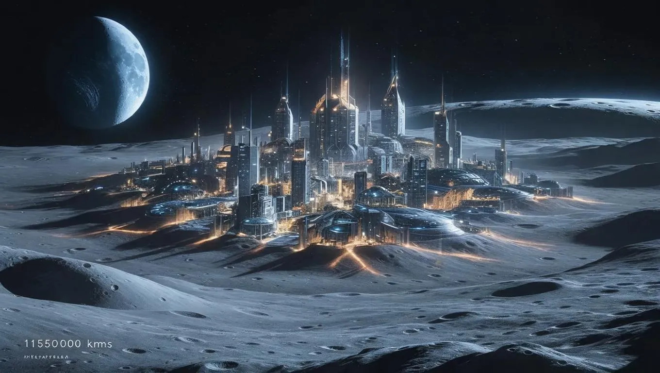 A breathtaking, long-range view of a colossal alien colony sprawled across the dark side of the moon, illuminated by the radiant glow of hyper-mega cities. From a distance of 150000 kms, the cities, a symphony of bright lights, stretch across the moon's dark surface, casting an eerie yet captivating glow. In the background, the Earth, a mere speck, lingers ominously on the horizon, adding a sense of scale and mystery to this alien metropolis.