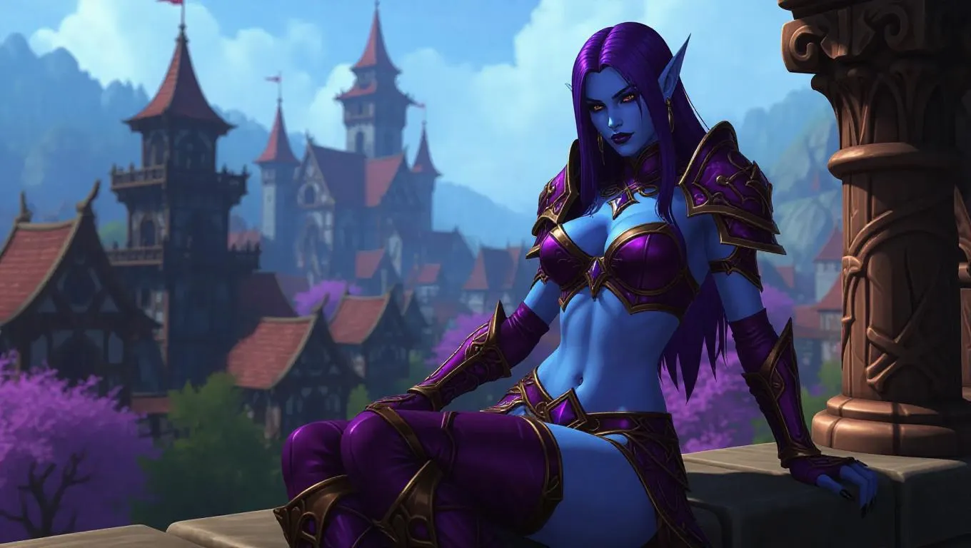 Discover AI-generated art of Sylvanas Windrunner as a fierce undead elf in maroon bikini armor and thigh-high boots. This striking image blends dark fantasy allure with warrior elegance, capturing her lithe form and bold demeanor atop Orgrimmar's parapet. Perfect for Warcraft fans seeking edgy, AI-crafted character designs with a flirtatious, commanding aesthetic.