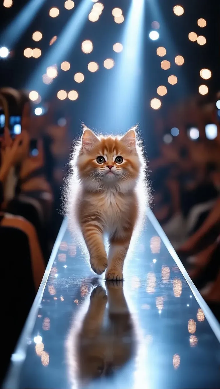 Generate a playful AI video of a cat strutting on a fashion runway with dynamic lighting and crowd effects. Vivago.ai turns text prompts into vibrant animations, offering professional editing tools for creating eye-catching animal-themed content. Perfect for social media creators seeking whimsical, high-quality AI-generated pet scenarios.