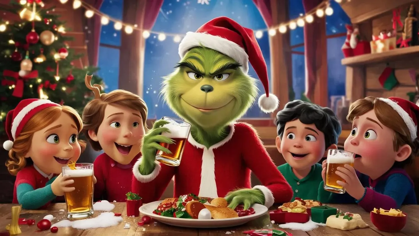 Generate a twisted Pixar-style movie poster with vivago.ai's AI tools. "The Missing 'Food' & Drinks" blends dark humor and holiday chaos, featuring a mischievous Grinch devouring kids and vodka. Create surreal AI art, explore edgy effects, and design eye-catching visuals for quirky, imaginative storytelling. Perfect for bold, AI-powered graphic design.