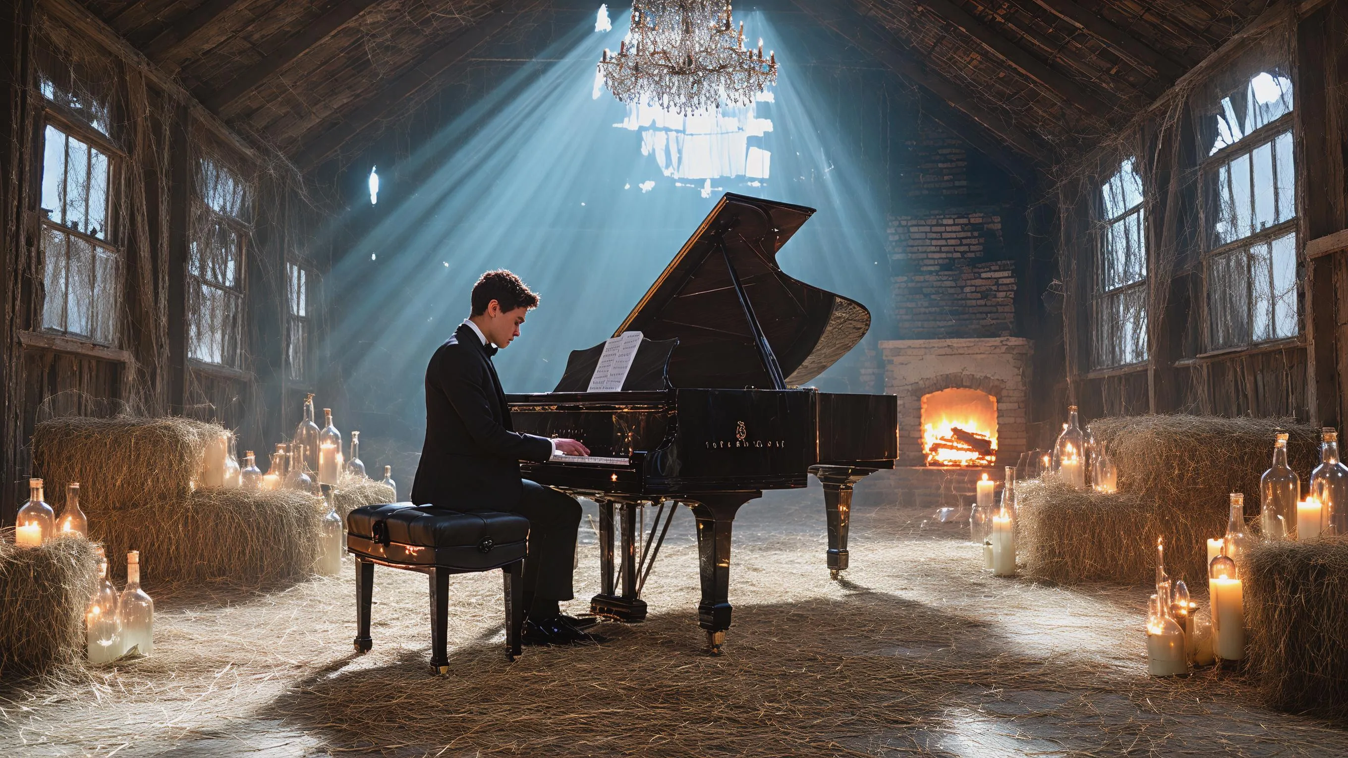 Generate AI images of an elegant pianist passionately performing in a moonlit, ruined barn. Create dramatic scenes with a grand piano, cracked concrete, scattered hay, broken windows, and flickering candlelight. Vivago.ai transforms your vision into stunning AI art with atmospheric effects.