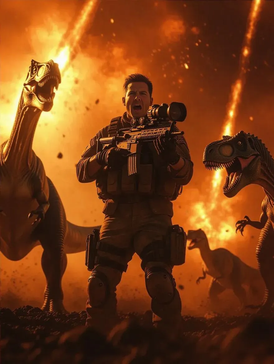 A dramatic, high-energy scene where a battlefield journalist, with a look of intense urgency, reports live on the imminent asteroid impact threatening Earth. The journalist, clad in rugged reporter gear, stands in the foreground, with a professional camera capturing the chaos. Behind, massive dinosaurs are frantically fleeing, adding a surreal element to the apocalyptic scene. The sky is filled with fiery streaks from the asteroid, while the ground trembles with the dinosaurs' powerful movements. Photorealistic textures, dynamic lighting, and deep contrasts highlight the tension, with vibrant colors amplifying the urgency of this cinematic disaster moment.