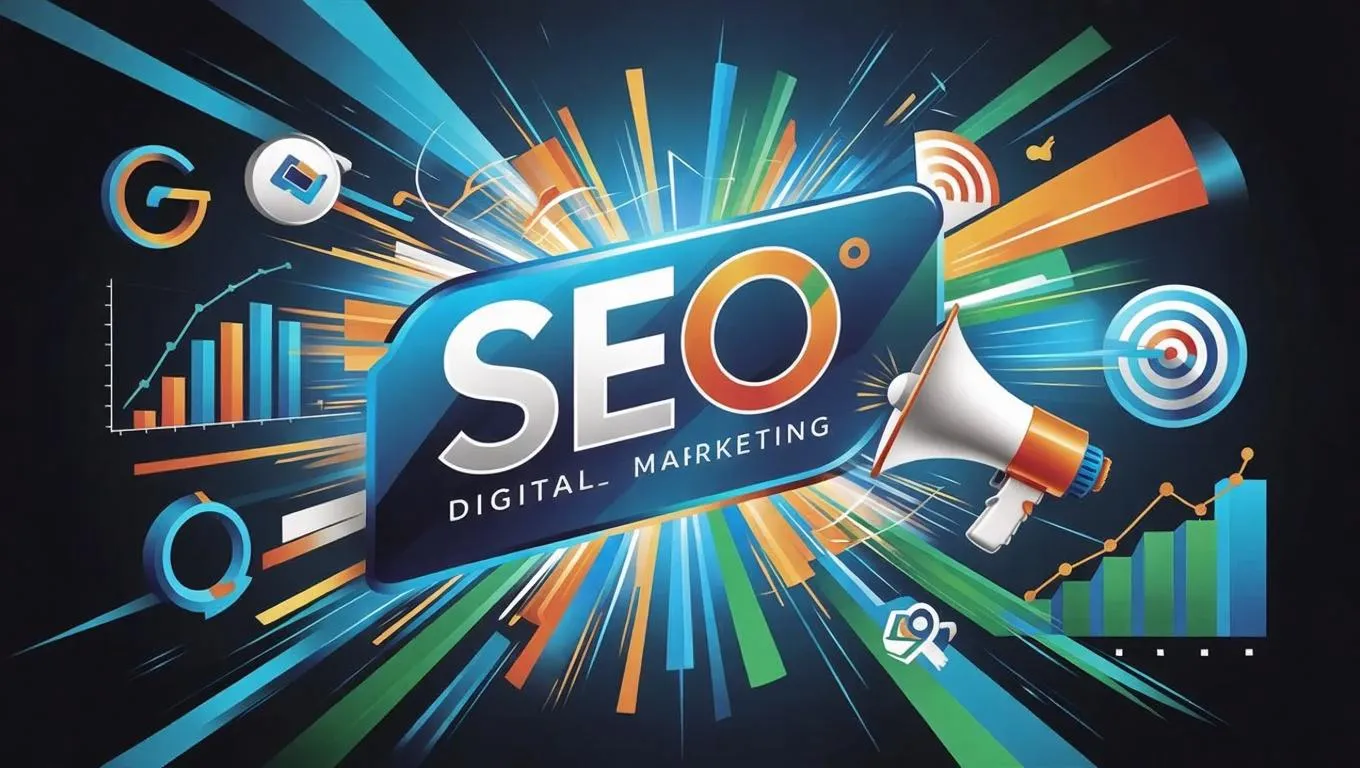 AI-powered vibrant illustration blending SEO and digital marketing elements—analytics charts, search engine icons, megaphone, target. Features keywords, website optimization, audience growth graphs. Professional blue, green, orange palette energizes dynamic strategies. Minimalist style with subtle tech textures highlights sleek marketing components. Ideal for forward-thinking digital brands.