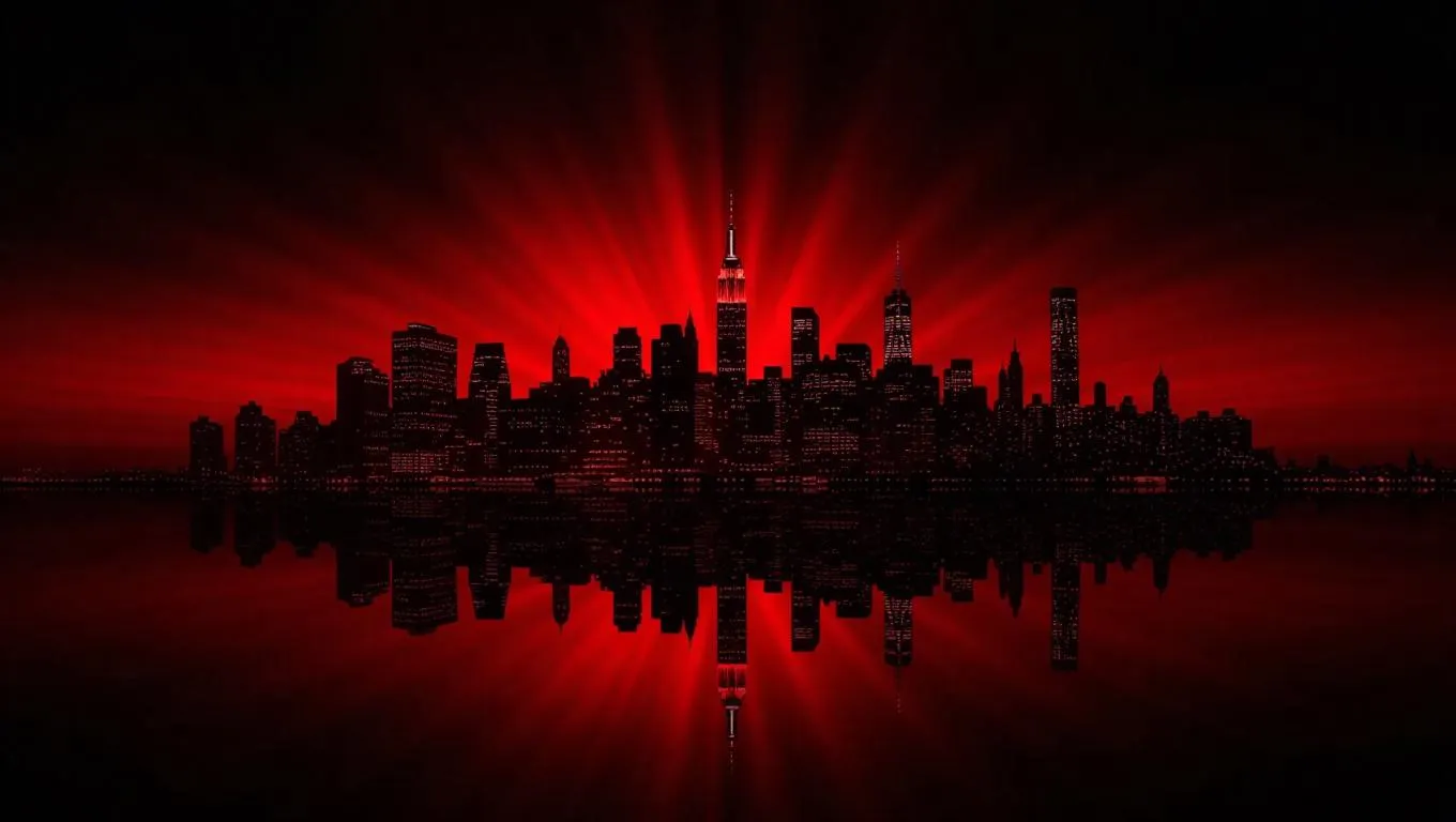 Generate striking abstract artwork with AI. Dark skyline silhouettes against deep black backdrop contrast vibrant red streaks, creating dynamic light reflections. Evoke mystery and intensity in dramatic cityscapes—ideal for professional-grade visual effects and creative projects.