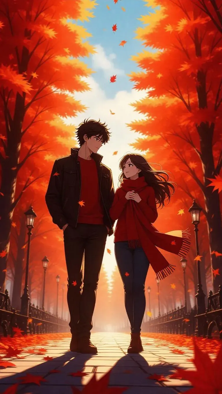 Anime-style park scene during peak autumn, red and orange leaves gently falling around Elias and Liora as they walk side-by-side under towering trees. Elias, tall and lean with tousled dark brown hair and hazel eyes, looks like he’s about to speak but hesitates. Liora, medium height with long wavy auburn hair and fair skin, turns with a hopeful smile, holding a scarf to her chest. A soft wind blows her hair and the leaves around them in slow motion, creating a serene and nostalgic atmosphere.