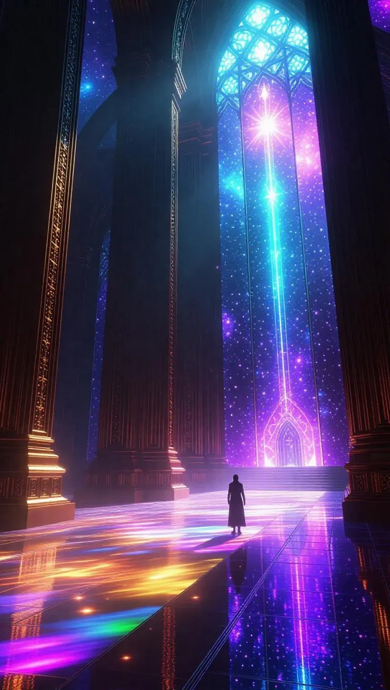 A colossal temple forged from diamond and starlight, floating in celestial orbit. Ancient titans of rainbow crystal stand silently, each holding fragments of forgotten universes in their chests. Cosmic winds swirl, stardust rains through stained-glass windows, casting kaleidoscopic patterns on the sacred floor of swirling constellations.